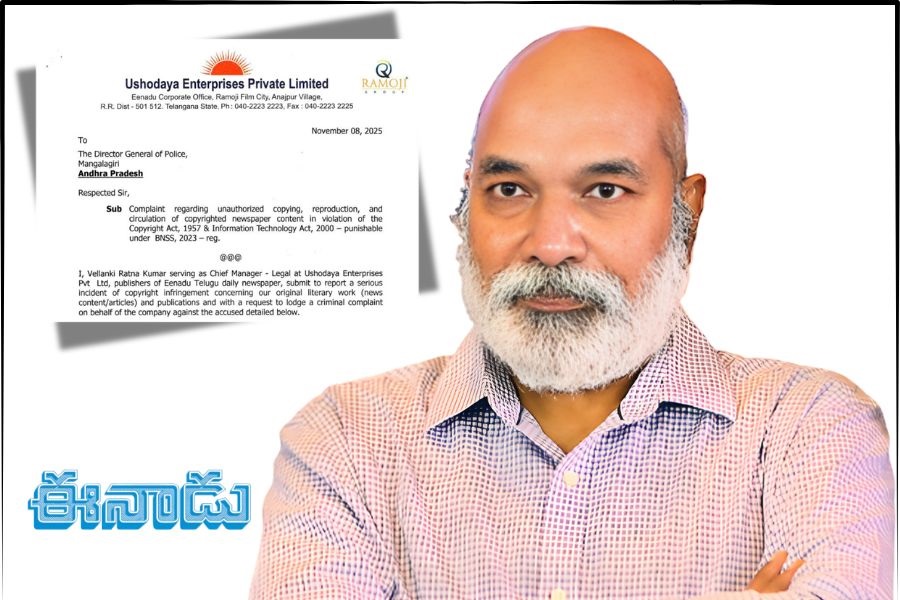 Amaravati: Ushodaya Enterprises Pvt. Ltd., the publisher of Eenadu, has lodged a formal complaint with the Andhra Pradesh DGP alleging large-scale copyright infringement through WhatsApp groups. In a letter dated November 8, 2025, the company’s Chief Manager–Legal, Vellanki Ratna Kumar, detailed how individuals have been copying and circulating complete PDF versions of Eenadu’s daily newspaper across multiple WhatsApp groups without authorisation.