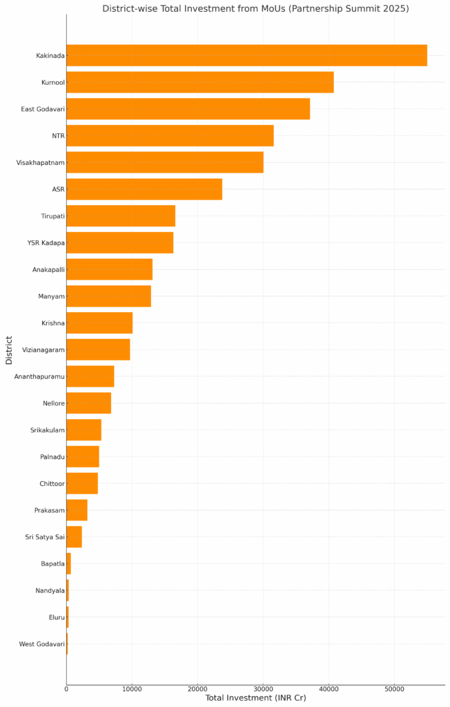Overall, the district-level spread shows a heavy concentration of investments in coastal and industrial corridors, while interior districts attracted sector-specific proposals. The consolidated MoUs reflect Andhra Pradesh’s strong positioning in green energy, semiconductors, industrial parks, and port-led development.