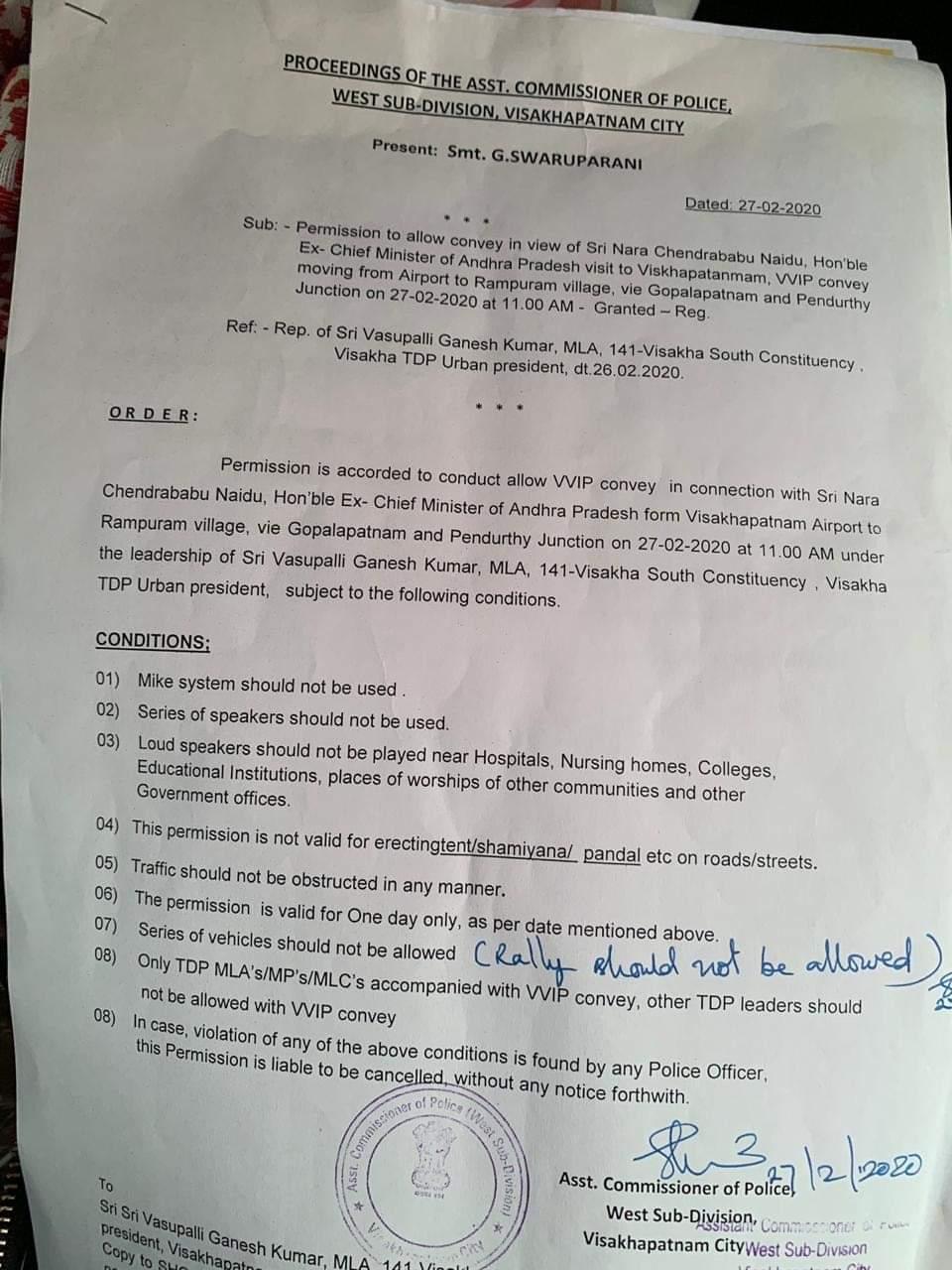 The TDP has produced the permission granted by Vizag Assistant Commissioner of Police, West Zone on an application by MLA Vasupalli Ganesh Kumar of TDP. The letter said that permission is accorded to allow VVIP convoy in connection with Nara Chandrababu Naidu visit to the airport to Ramapuram village via Gopalapuram and Pendurthy Junction.