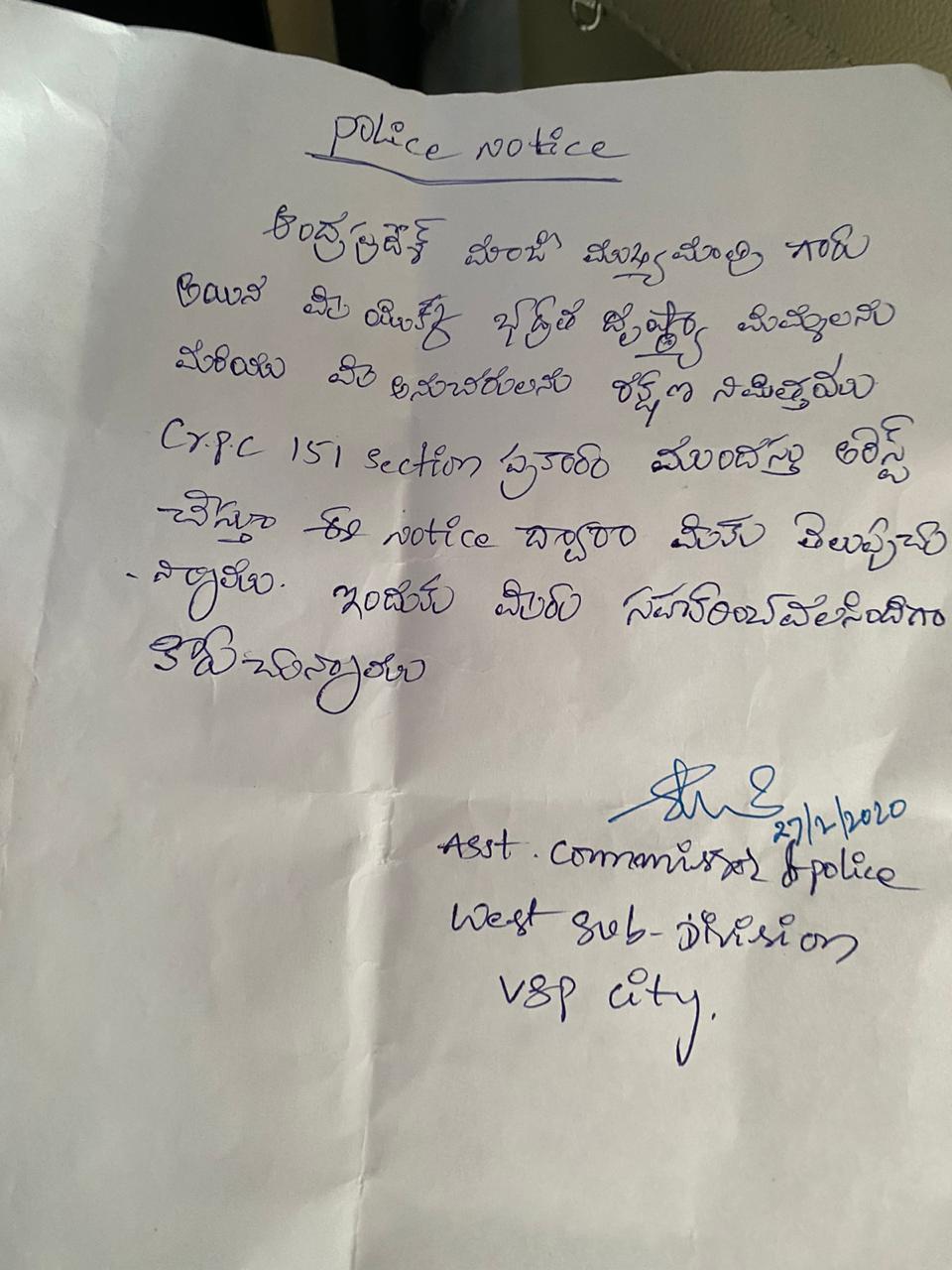 Besides, the notice that was served to Chandrababu did not look like the official communication, as it was written by hand on plain paper.